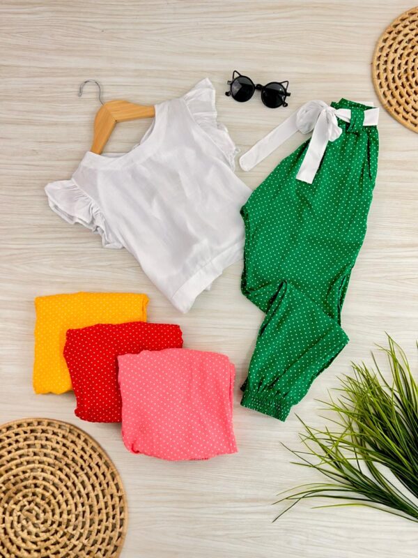- Estampa de poá: Traz um toque clássico e ao mesmo tempo divertido, ideal para diferentes ocasiões, O CROPPED É BRANCO, O QUE MUDA É A COR DA CALÇA. EX: Amarelo, ou seja, calca amarela e cropped branco.