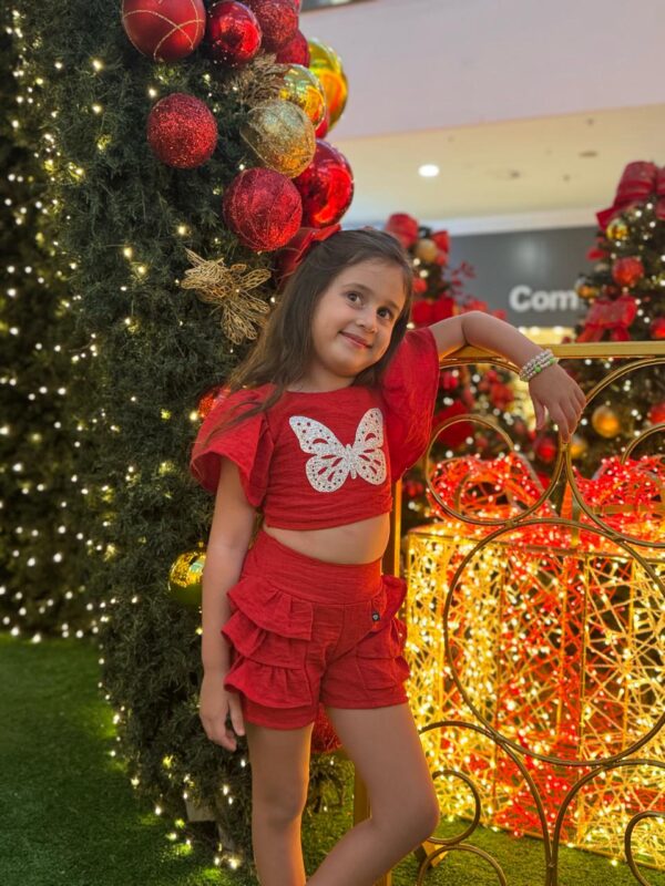 O Conjunto Short Borboleta é perfeito para meninas que amam um visual delicado e cheio de estilo. Com um cropped com aplicação de borboleta e amarração nas costas, junto a um short com babados , esse conjunto proporciona um toque moderno e charmoso para eventos especiais.
